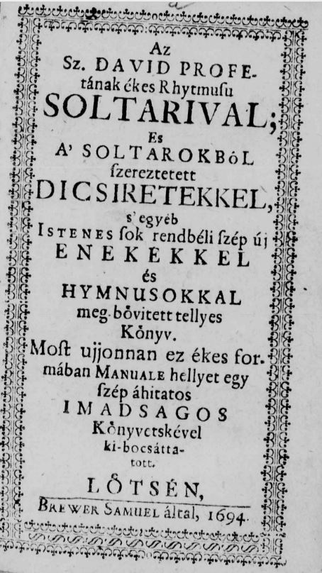| Cím | A szent Dávid prófétának ékes ritmusú zsoltárival és a zsoltárokból szereztetett dicséretekkel, s egyéb istenes énekekkel és himnuszokkal megbővíttetett teljes könyv. |