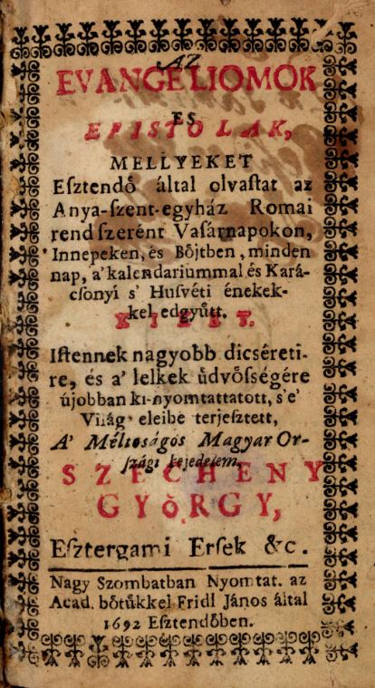 | Cím | Az evangéliumok és episztolák, melyeket esztendő által olvastat az anyaszentegyház vasárnapokon és az ünnepeken; a kalendáriummal; egynéhány karácsonyi és húsvéti énekekkel; és az igaz keresztyéni és apostoli hitnek ismeretéről való rövid tanúsággal |