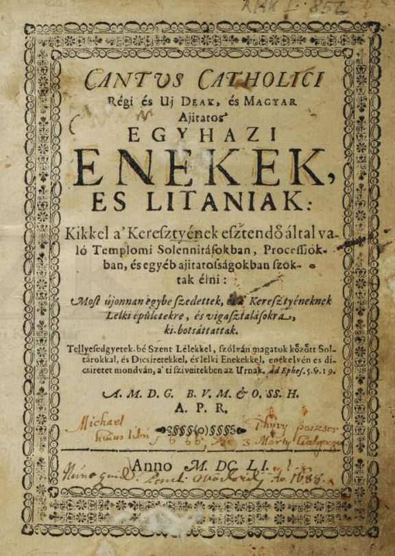 | Cím | Cantus Catholici. Régi és új deák és magyar egyházi énekek és litániák, kikkel a keresztyének esztendő által való szolennitásokban, processzoiókban és egyéb ájtatosságokban szoktak élni. |