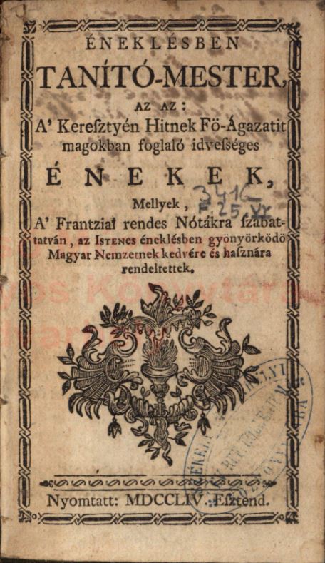 | Cím | Éneklésben tanító mester, azaz a keresztyén hitnek fő ágazatit magokban foglaló üdvösséges énekek, melyek a franciai rendes nótákra szabattatván az istenes éneklésben gyönyörködő magyar nemzetnek kedvére és hasznára rendeltettek. |