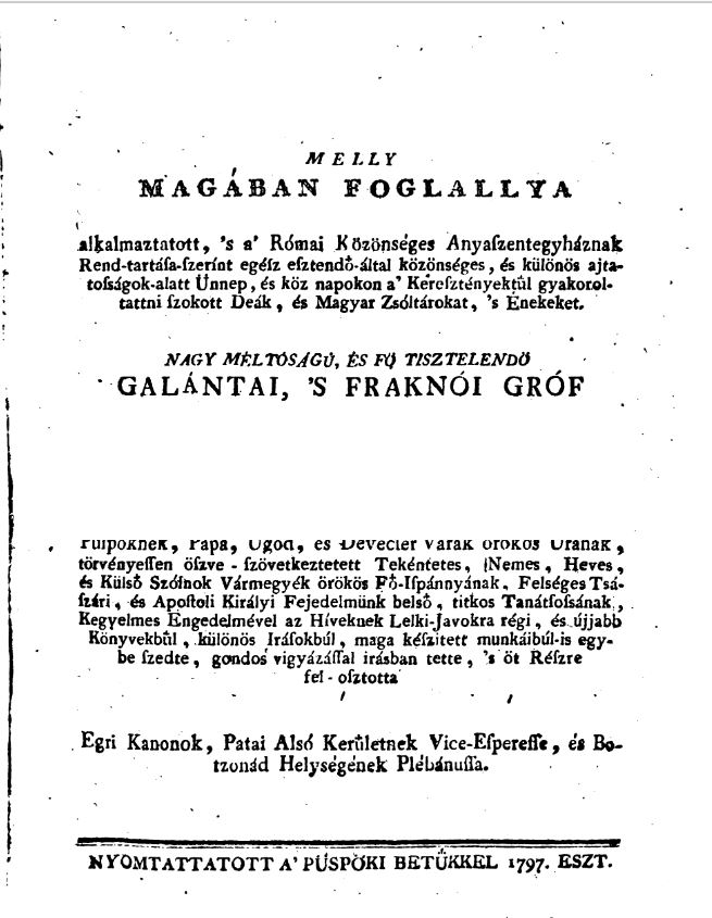 | Cím | Egyházi énekeskönyv, mely magában foglalja az Istennek dicséretéhez és a szentek tiszteletéhez alkalmaztatott, a római közönséges anyaszentegyháznak rendtartása szerint egész esztendő által közönséges és különös ájtatosságok alatt, ünnep és köz napokon a keresztényektől gyakoroltatni szokott deák és magyar zsoltárokat s énekeket. |