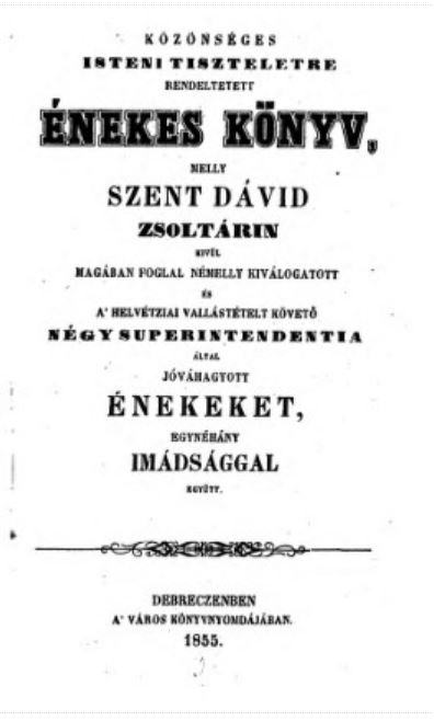 | Cím | Közönséges isteni tiszteletre rendeltetett énekeskönyv, mely szent Dávid zsoltárin kívül magában foglal némely kiválogatott és a helvéciai vallástételt követő négy szuperintendencia által jóváhagyott énekeket egynéhány imádsággal együtt |