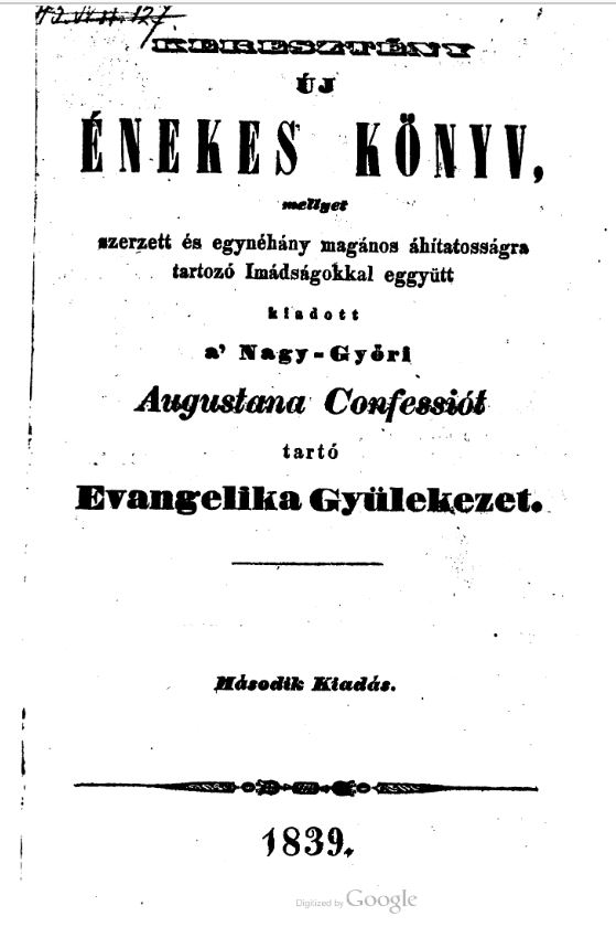 | Cím | Keresztyén új énekeskönyv, melyet szerzett és egynéhány magányos áhítatosságokra tartozó imádságokkal együtt kiadott a Nagy-Győri Augustana Confessiót tartó Evangelika Gyülekezet |