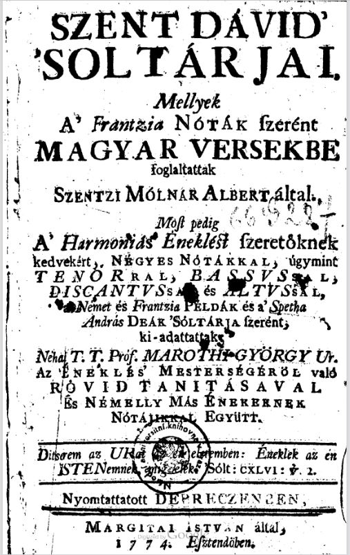 | Cím | Szent Dávid zsoltárai, melyek a franciai nóták szerint magyar versekbe foglaltattak Szenci Molnár Alber által, most pedig a harmóniás énekelést szeretőknek kedvükért négyes nótákkal […] kiadattattak |