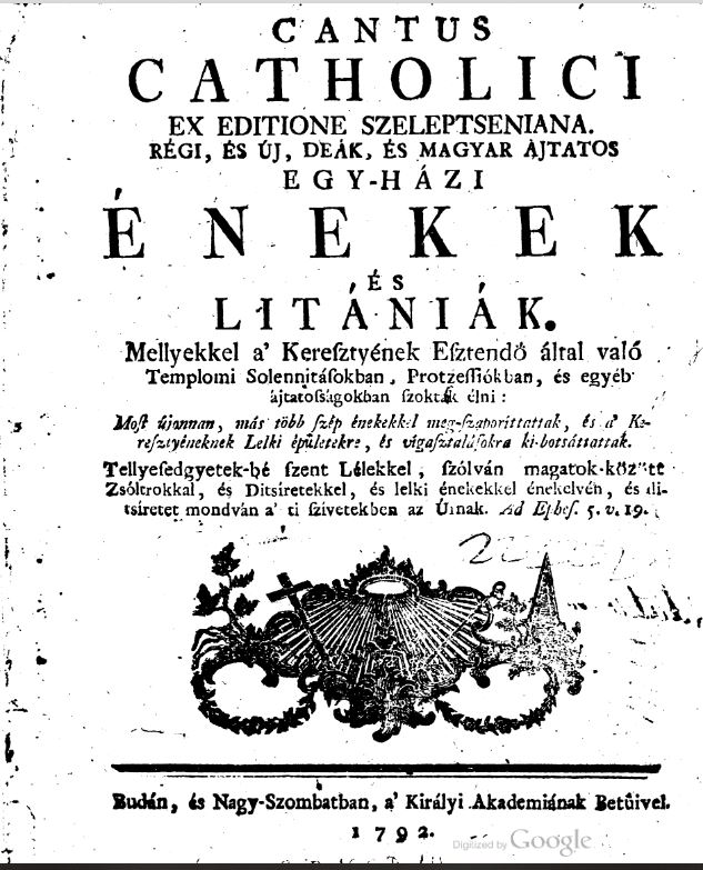 | Cím | Cantus Catholici ex editione Szeleptseniana. Régi és új deák és magyar egyházi énekek és litániák, kikkel a keresztyének esztendő által való szolennitásokban, processziókban és egyéb ájtatosságokban szoktak élni. |