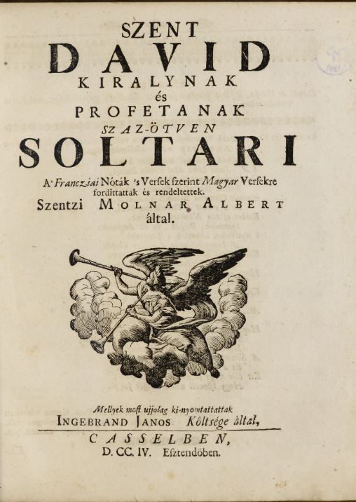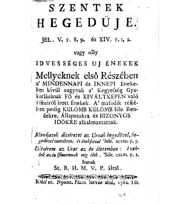 | Cím | Szentek hegedűje, vagy oly üdvösséges új énekek, melyek első részében a mindennapi és ünnepi énekeken kívül vannak a kegyesség gyakorlásának fő és kiváltképpen való részeiről írott énekek, a második részében pedig külömb-külömb féle állapotokra és bizonyos időkre alkalmaztattak. |